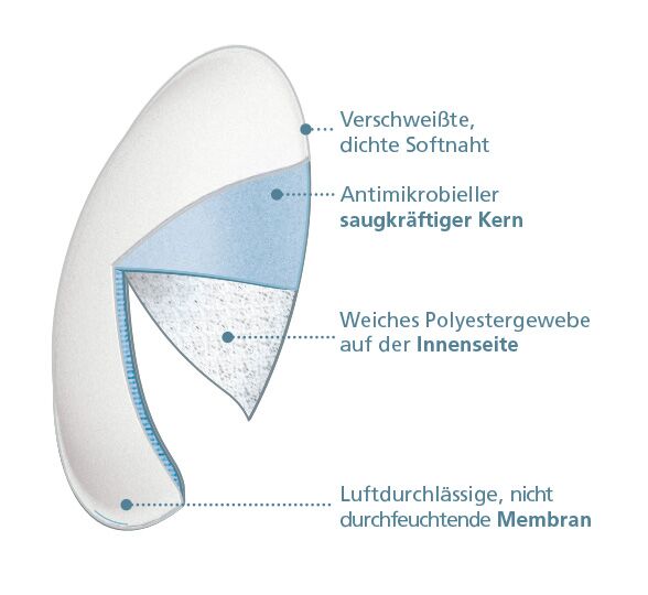 Our nursing pads are antimicrobial and breathable. This means moisture is quickly drawn away from the skin surface into the antimicrobial core, where it is retained. The outer breathable membrane prevents moisture from passing through. Inside the nursing pad, the growth of bacteria and fungi is reduced. This effect remains after washing.